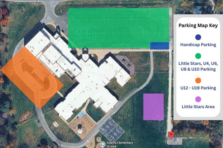 The green area is for families in Little Stars, U4, U6, U8 & U10. The orange area behind the school to the right when you pull is will be for our U12-U19 families. We will continue to have designated handicap parking near the entrance. Yard signs will be placed in the Adams lot as you enter to remind you where to park.